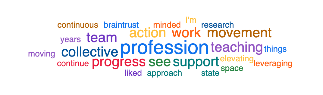 It was wonderful to reconnect with so many of you. When asked what your takeaway from the brief progress update, we generated the following word cloud--highlighting the importance of working together, through this movement, to elevate the teaching profession.