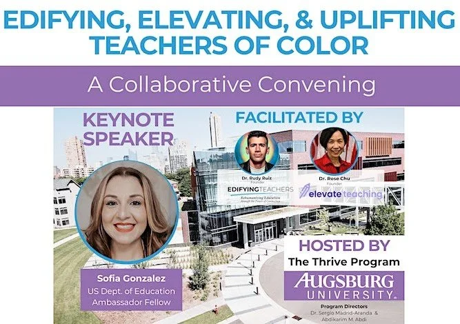 Elevate Teaching is partnering with Edifying Teachers and the Thrive Program at Augsburg University for "Edifying, Elevating, and Uplifting Teachers of Color." This convening is an opportunity for prospective teachers, teacher candidates and alumni from different programs to connect and learn together. It is also an opportunity to bring different stakeholders together who are interested in and committed to attracting, supporting and retaining teachers of color in their journey.
